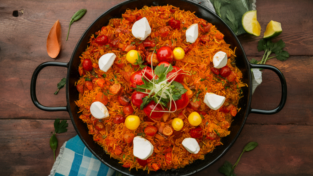 Cuando se presenta el plato final, es una vista para la vista: un tapiz vibrante de colores y texturas, cada componente contribuye al todo armonioso. La familia entra, saborea cada bocado,transportándose a las plazas de Valencia bañadas en el sol, donde la esencia de este plato atemporal está realmente vivo.
